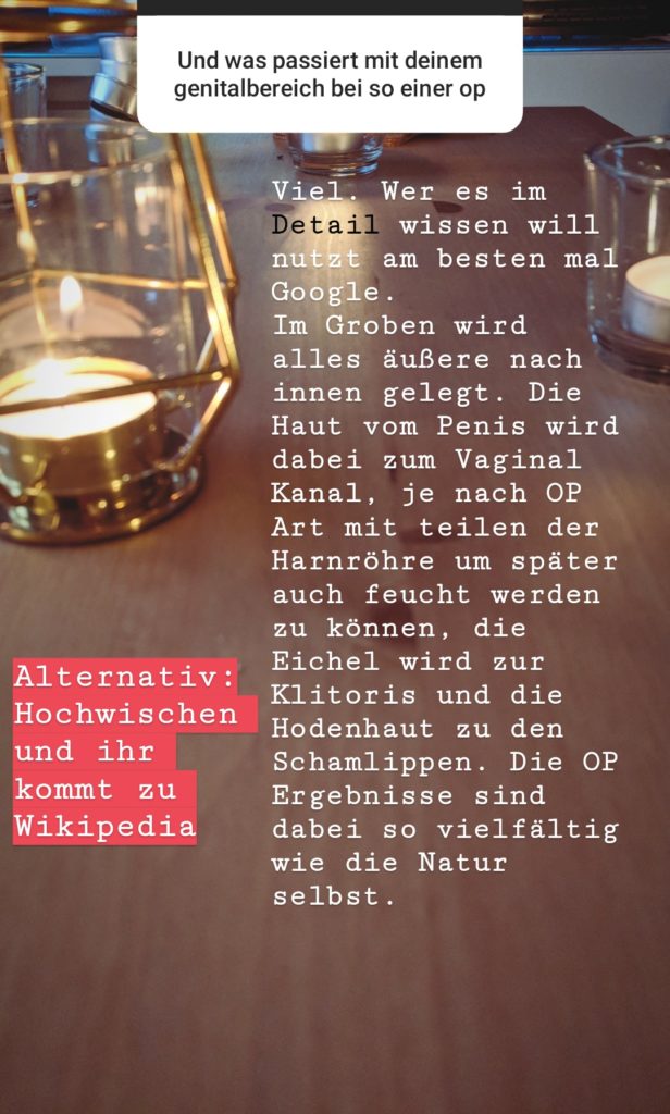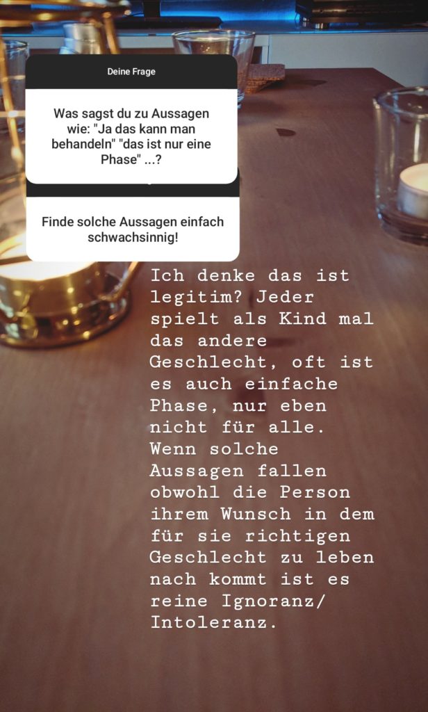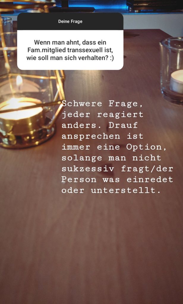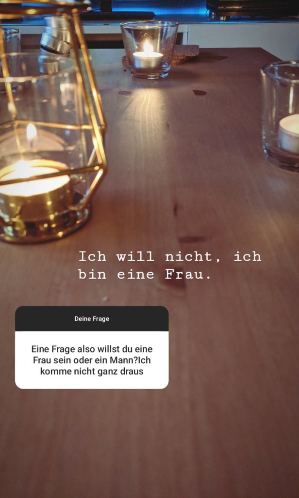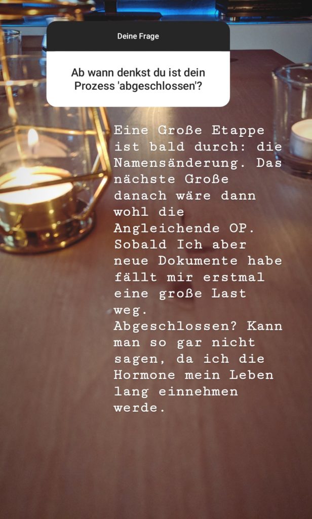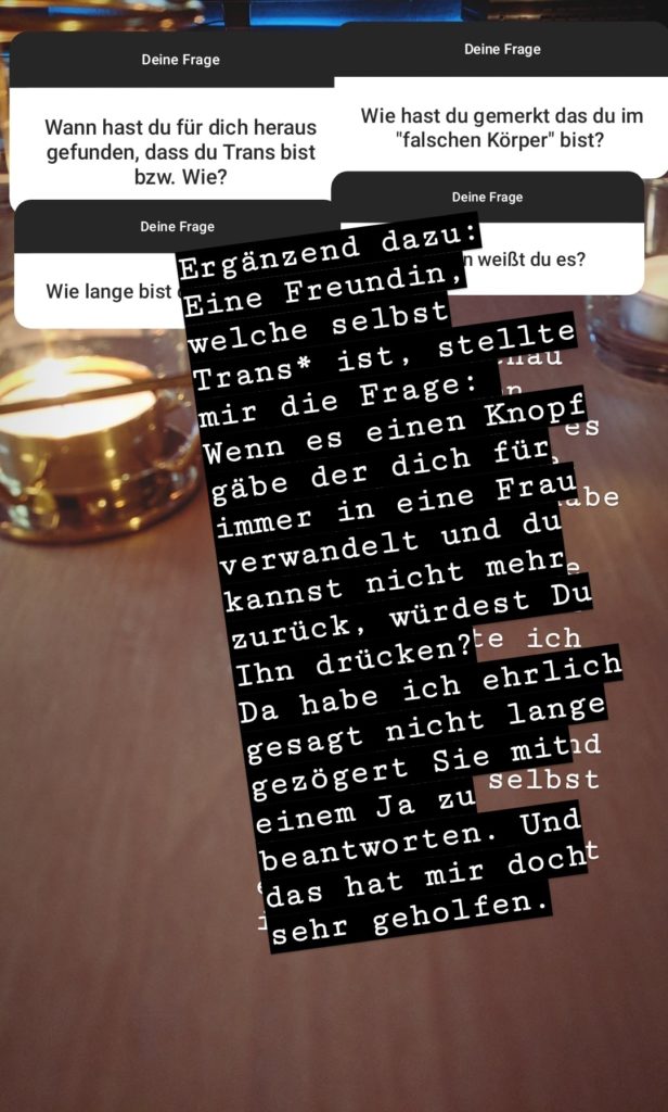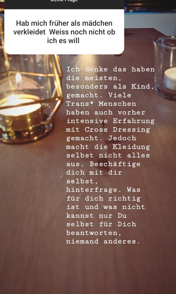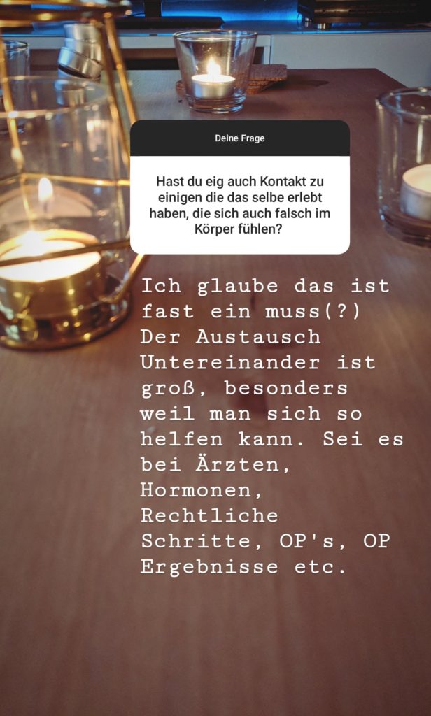 Kurz nach 20uhr habe ich den Account wieder verlassen, mit der Info dass man mir gerne auch privat schreiben darf bei Fragen. Das taten auch manche, einige bekundeten wie toll und klasse sie meine Offenheit fanden, andere dass ich versucht habe alles bestmöglich zu beantworten. Dann waren da aber noch 5 Nachrichten. 5 Nachrichten von Leuten denen ich Kraft geben konnte, 5 Leute die mir nach meiner Story schrieben sie werden den Weg der Transition auch einschlagen – dies kam natürlich nicht in der ersten Nachricht sondern nach einem längeren Chat.